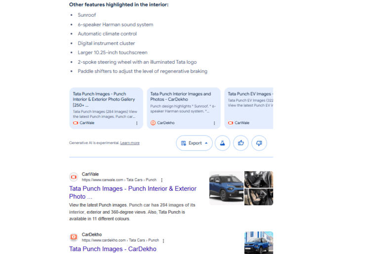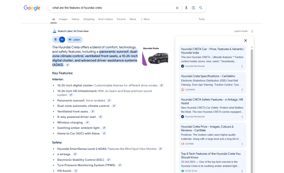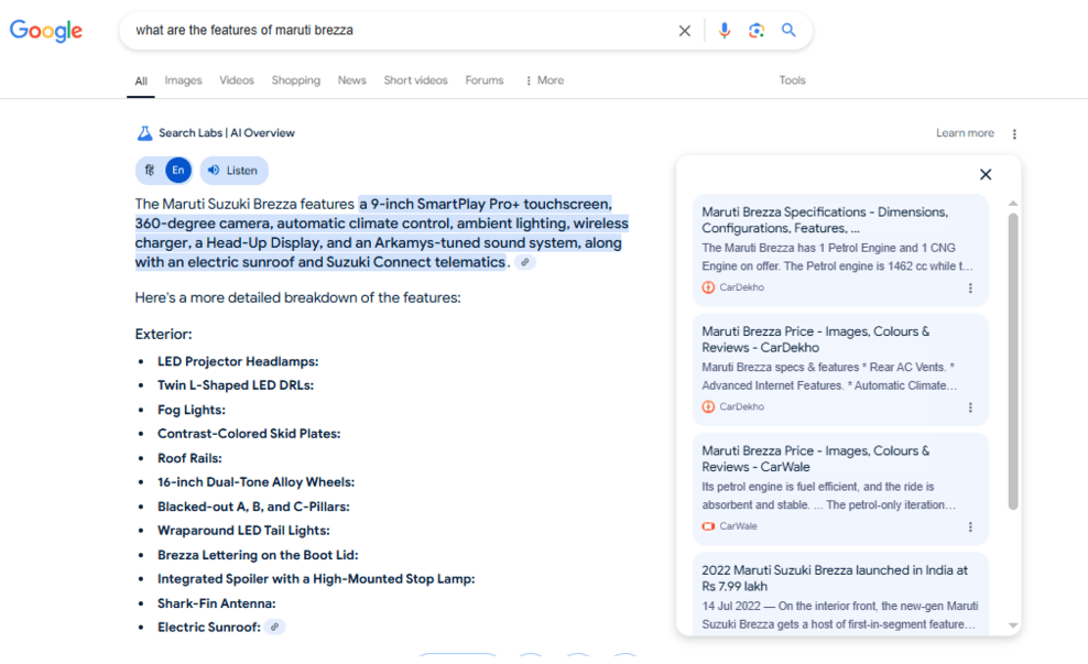 Next, we asked for features of specific cars of each manufacturer. Still, AI skipped the official websites, blogs, social media platforms and quoted review articles instead.