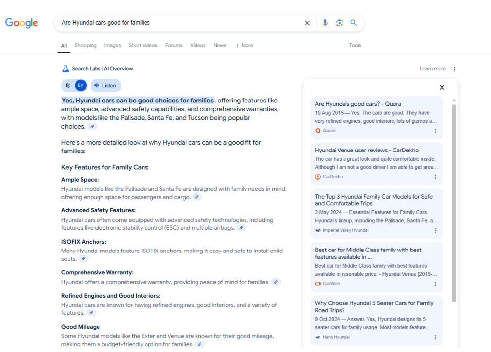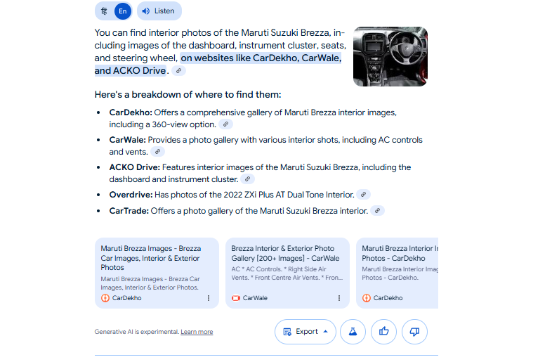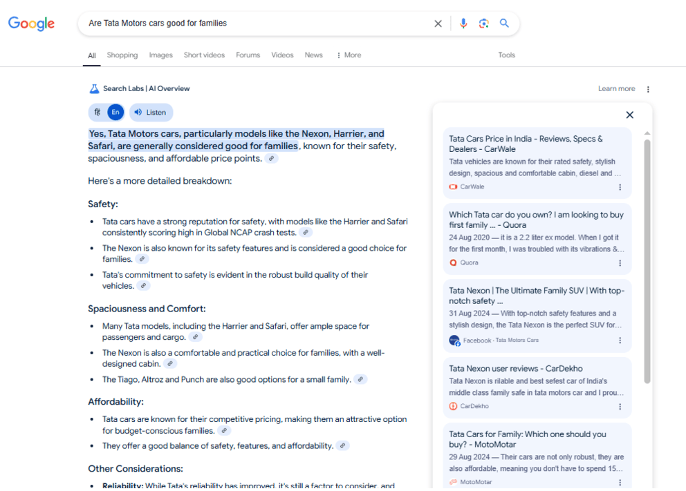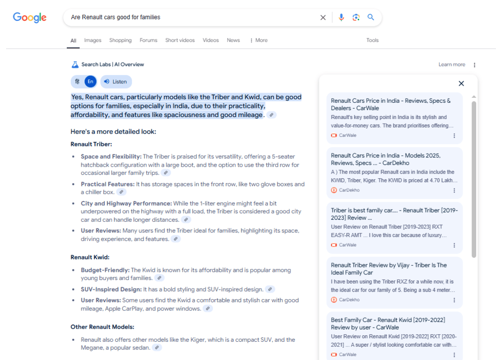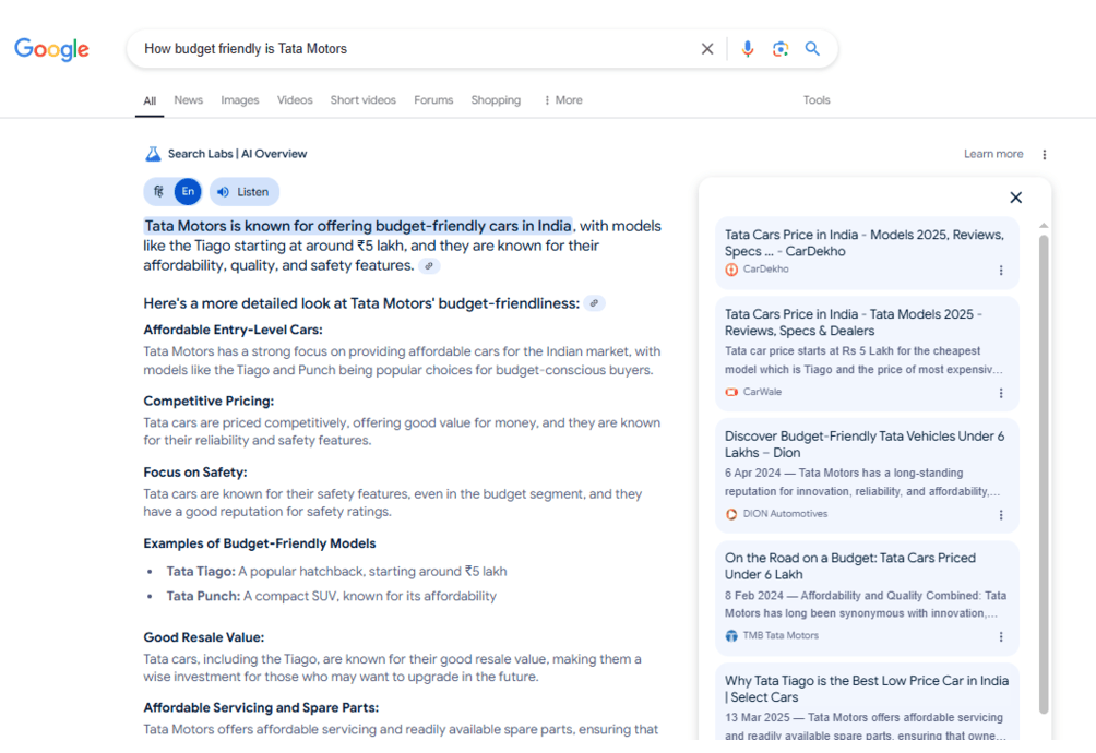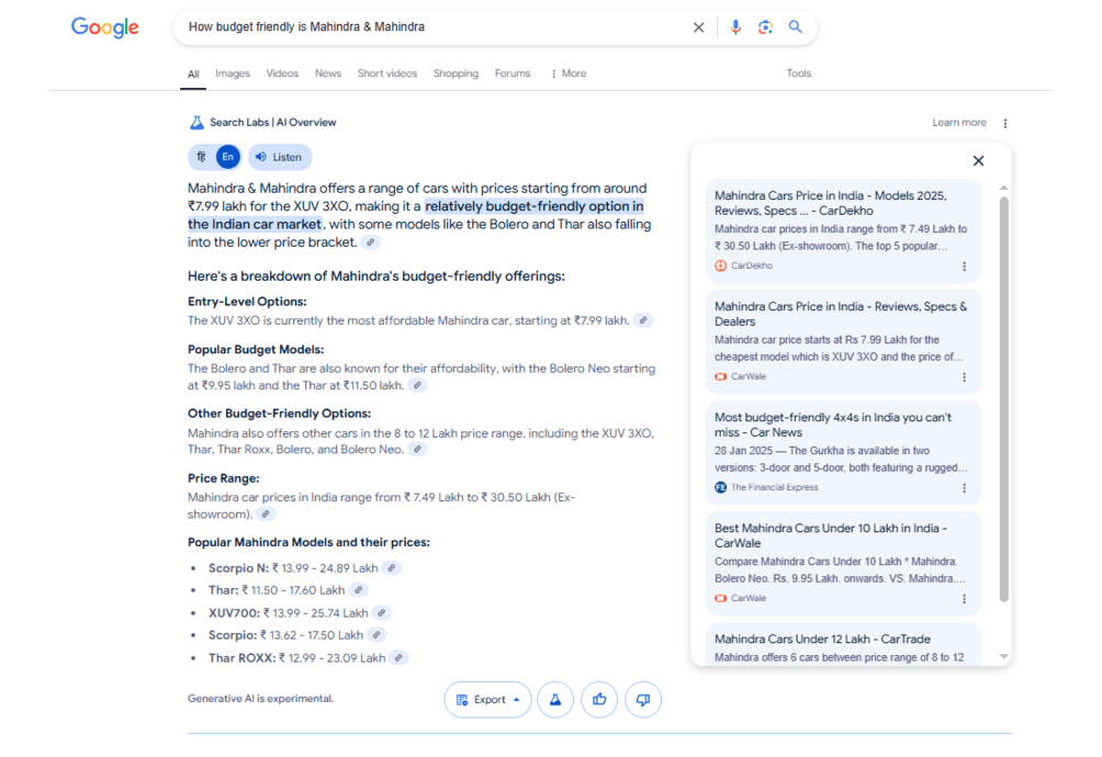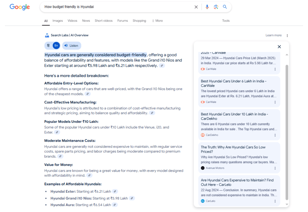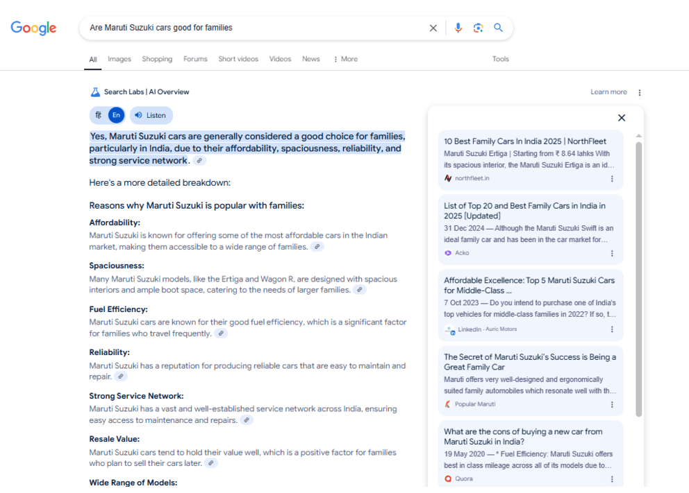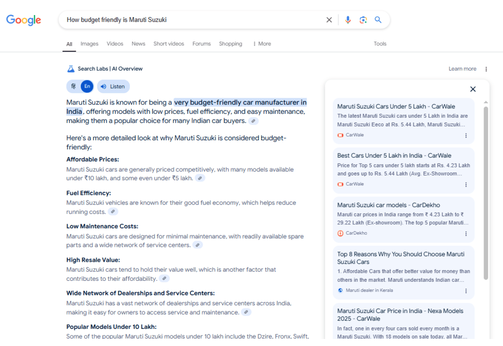 Take a basic question: “How budget-friendly is Maruti?” You’d think their site or blog would pop up in the AI overview. Nope. The AI answer pointed to third-party blogs and car comparison sites as sources. Even when the brand is mentioned by name, Google’s Search Labs didn’t trust the brand platforms to provide meaningful inputs for developing its answer.