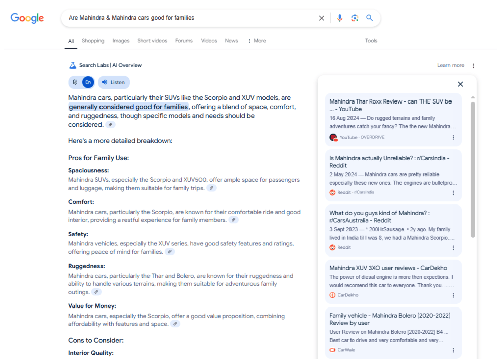 Hyundai showed up in links AI overview used to develop its answer. Tata didn’t. Mahindra? The AI pulled a Reddit thread titled “Is Mahindra actually unreliable?” on top.