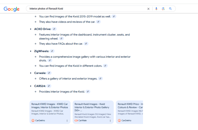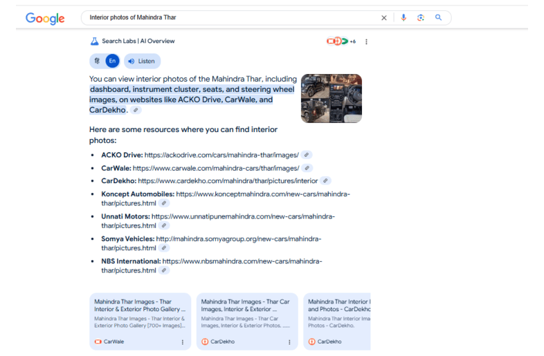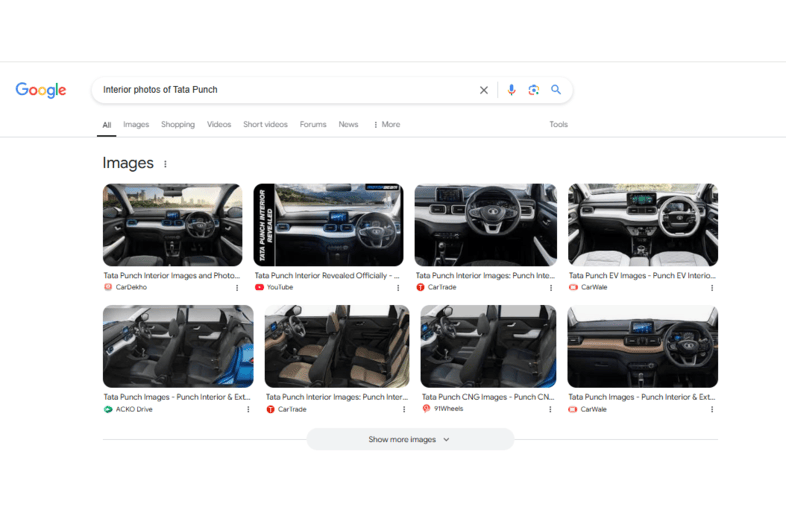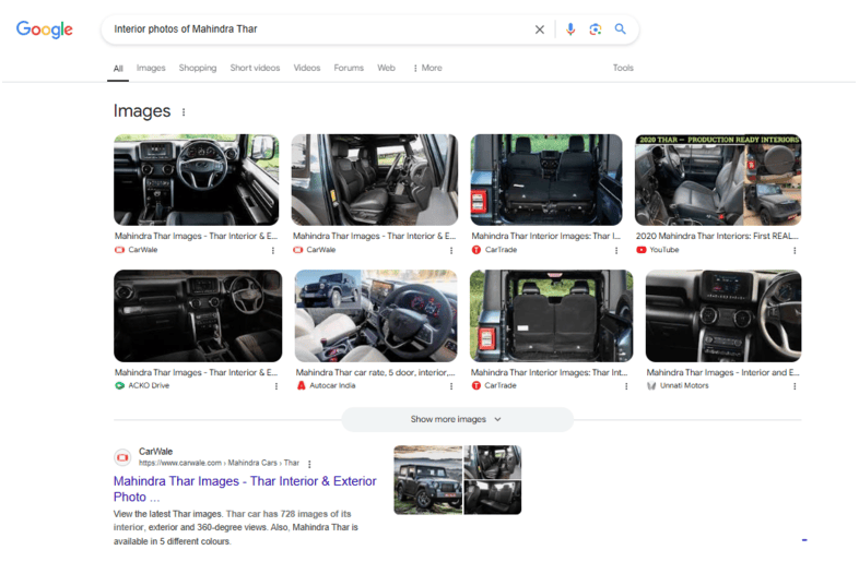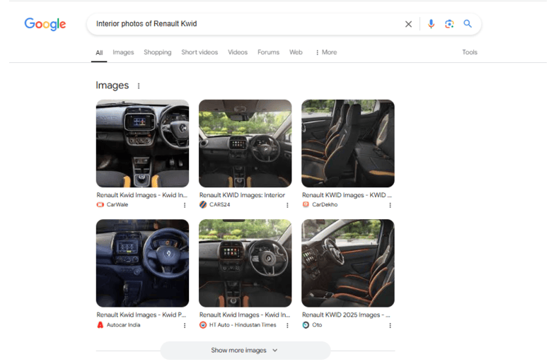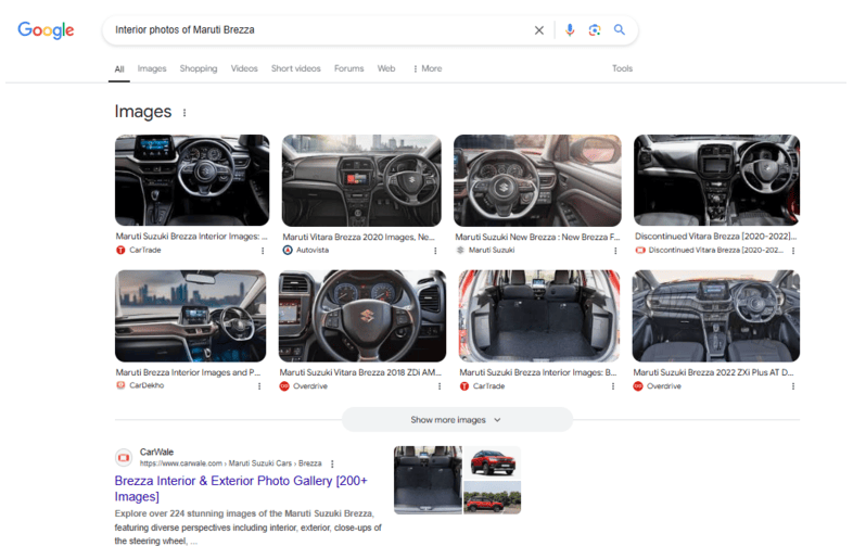 To give it another shot, we searched the most basic thing a buyer would search — photos of car interiors. Surely brands would show up for that, right? Not really. Many companies still failed to show up amongst images or cited links at the top. Alas, another missed opportunity.
