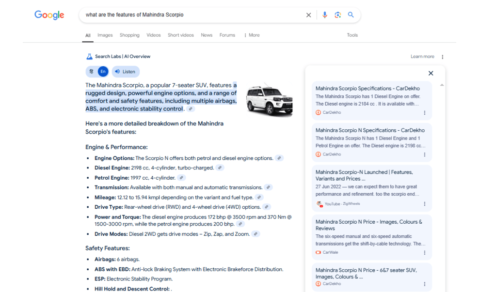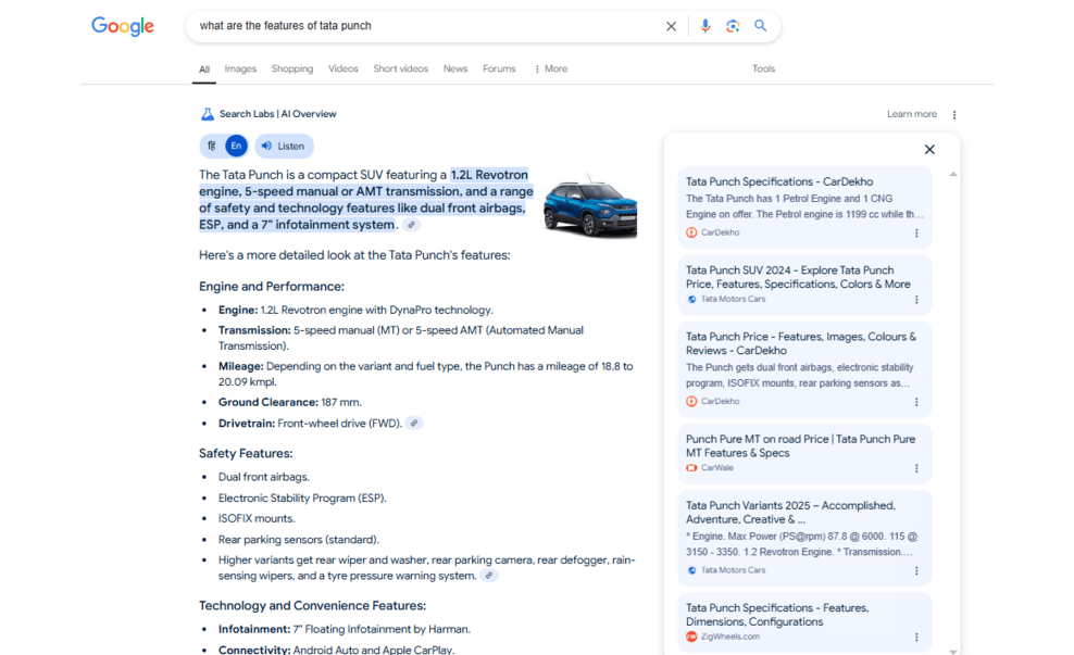Since AI overview answers queries now as a first response, we got curious. Do digital platforms of India’s biggest auto brands —Tata, Mahindra, Maruti, Renault — actually show up in reference links AI picks the answers from?