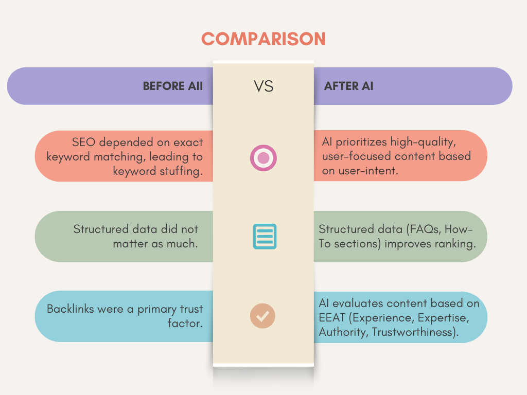 After AI: In 2018, Google introduced a major update called the Helpful Content Update, accompanied by the E-A-T framework (Expertise, Authority, Trustworthiness). This framework was later expanded to E-E-A-T in 2022 with the addition of “Experience.” While E-E-A-T isn’t a direct ranking factor, it provides guidance for publishers on how to create high-quality content and serves as a manual for Google’s search quality raters when assessing content credibility.