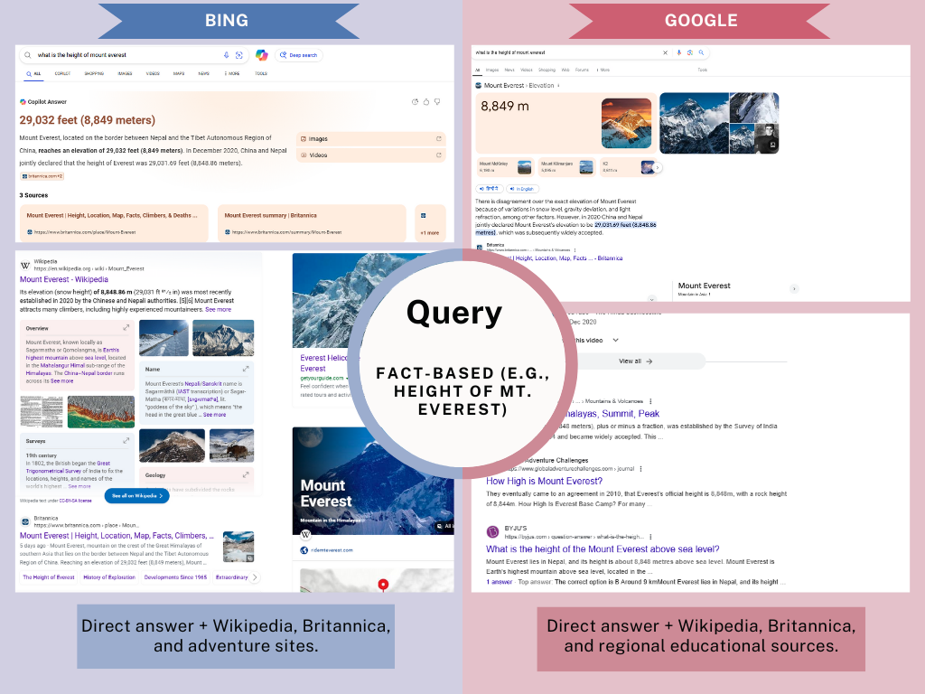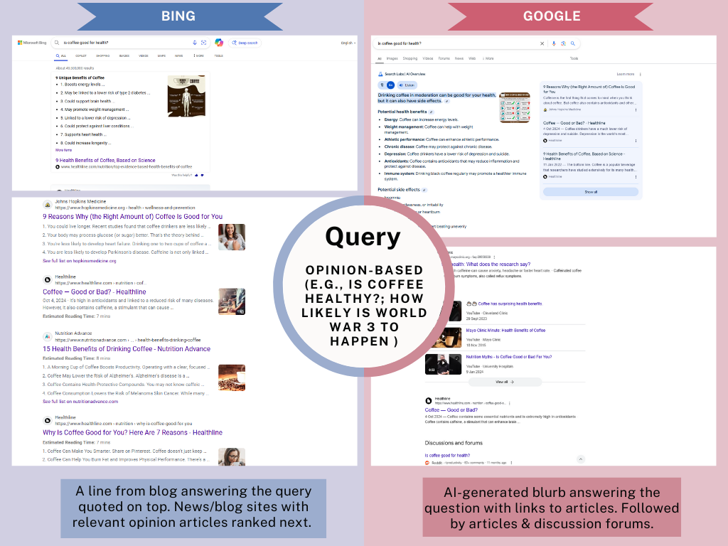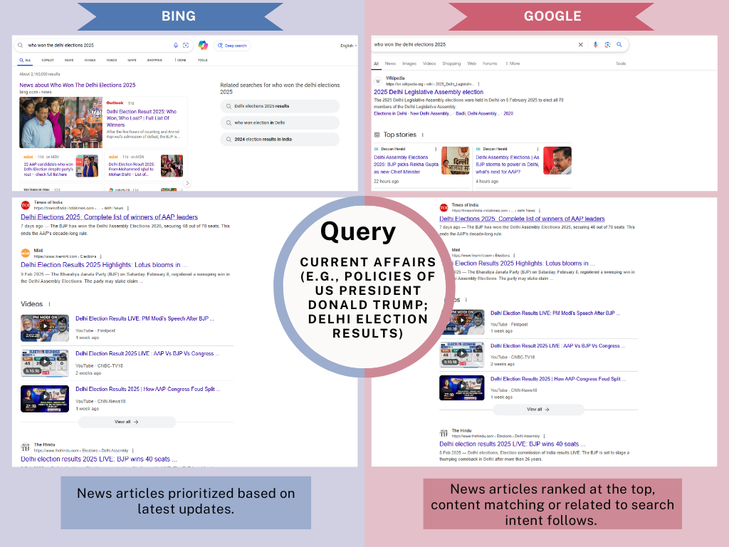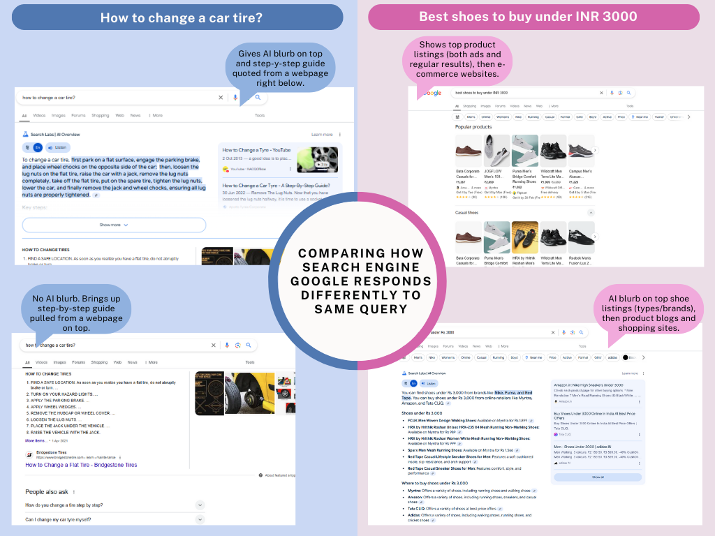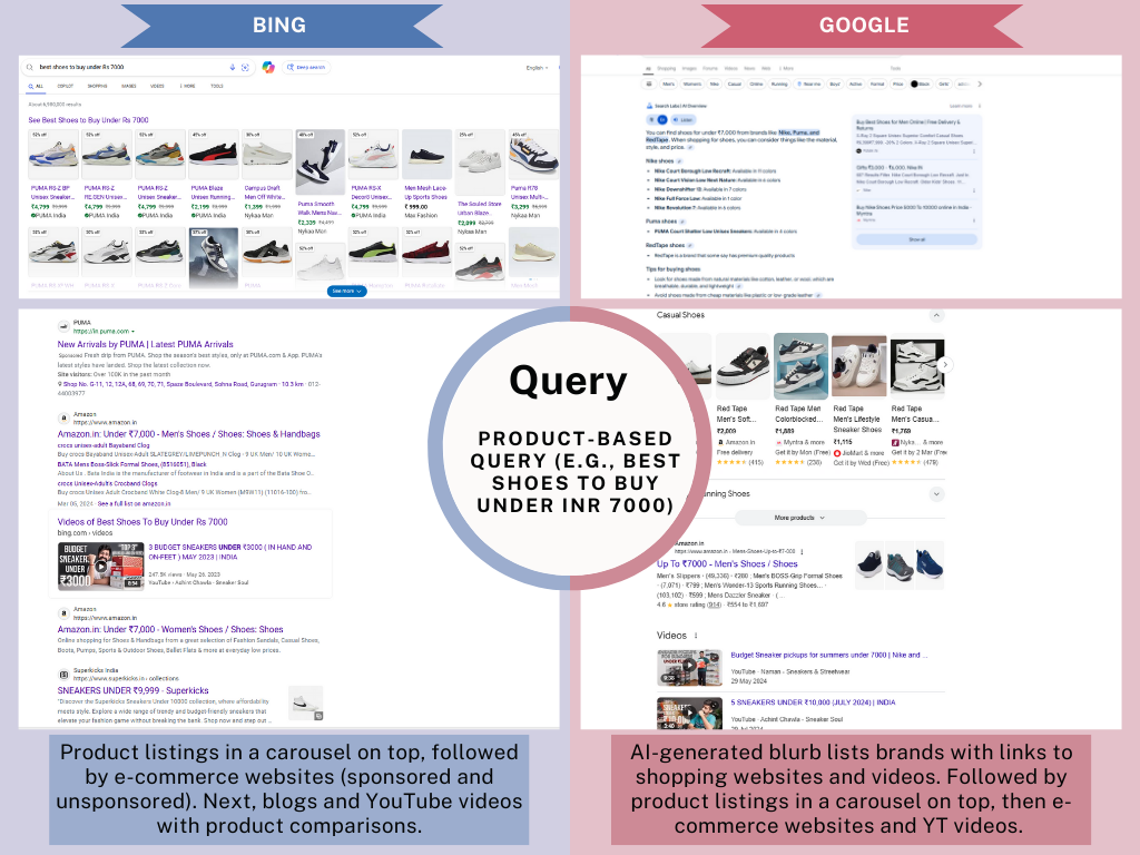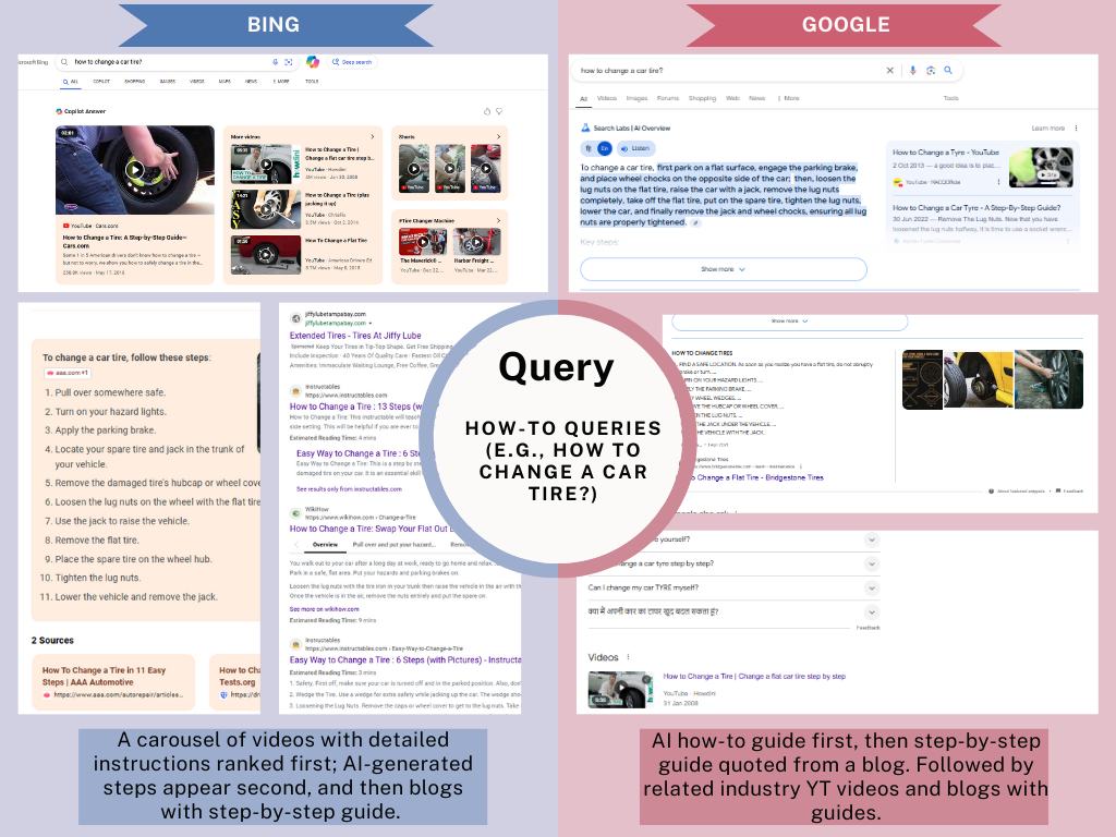 To better understand the patterns of AI responses, we conducted searches using various types of queries on Google Search Labs and Microsoft Bing. The results revealed that AI-generated answers do not consistently appear at the top; it depends on the type of query. The results also showcased a mix of carousel posts, related questions, YouTube videos, and blogs, illustrating how search engines prioritize diverse and relevant content. Interestingly, the same query does not always elicit an AI-generated answer from an engine, indicating that these systems continue to evolve.